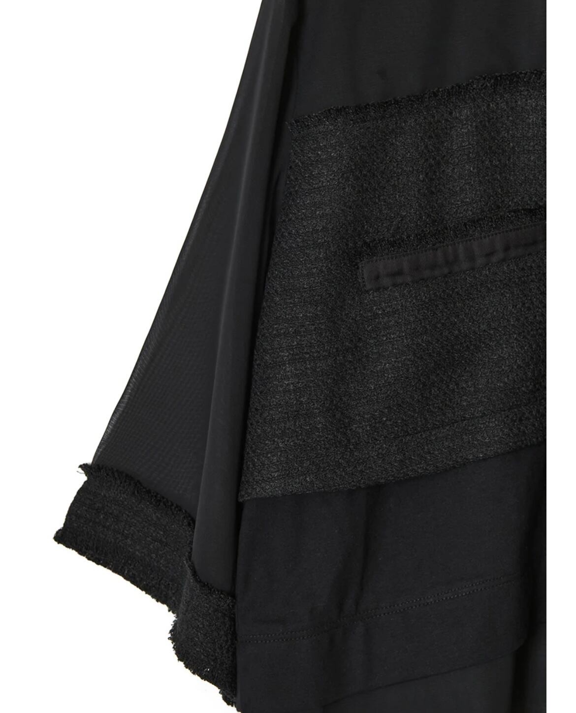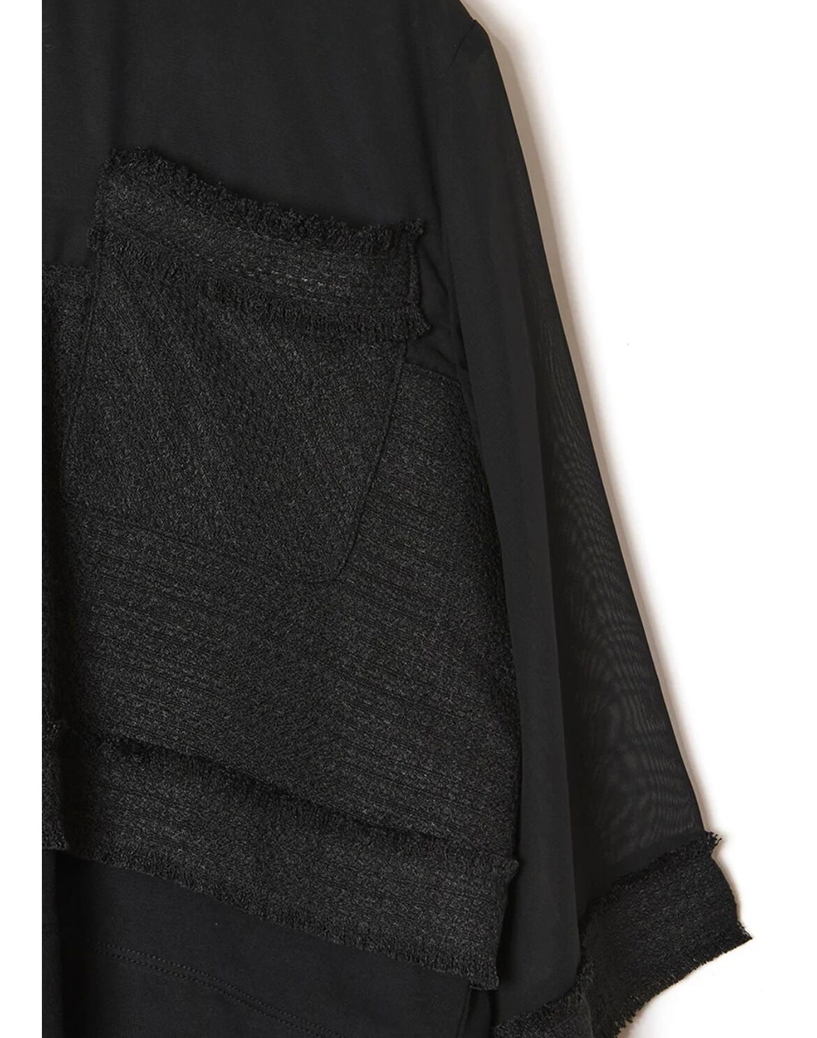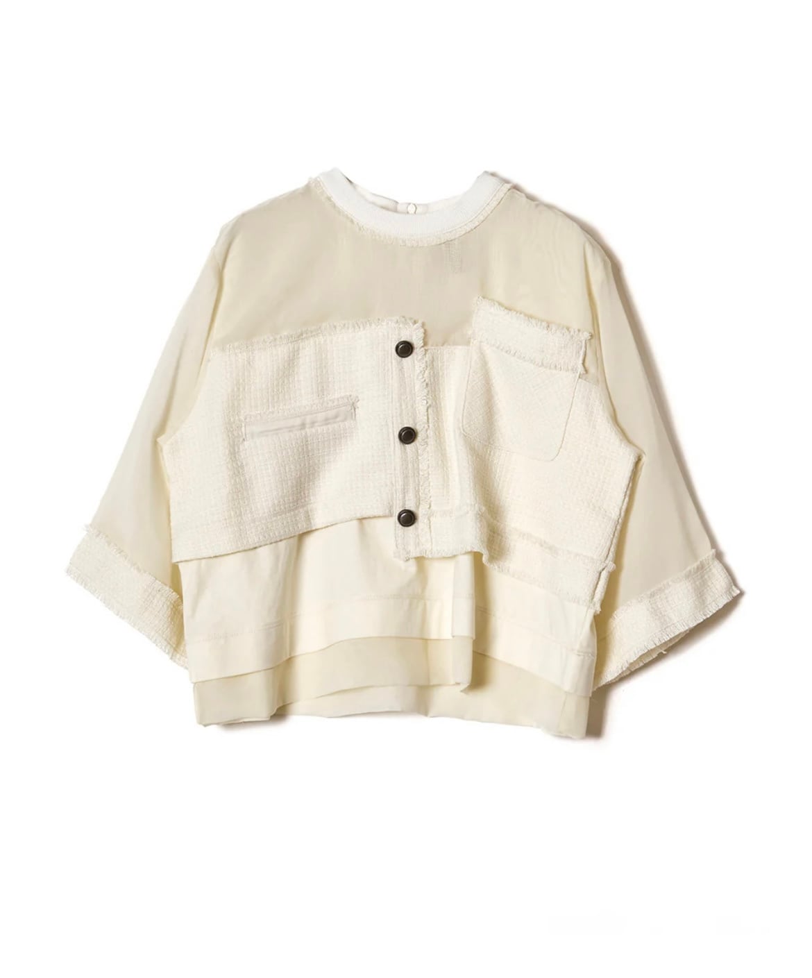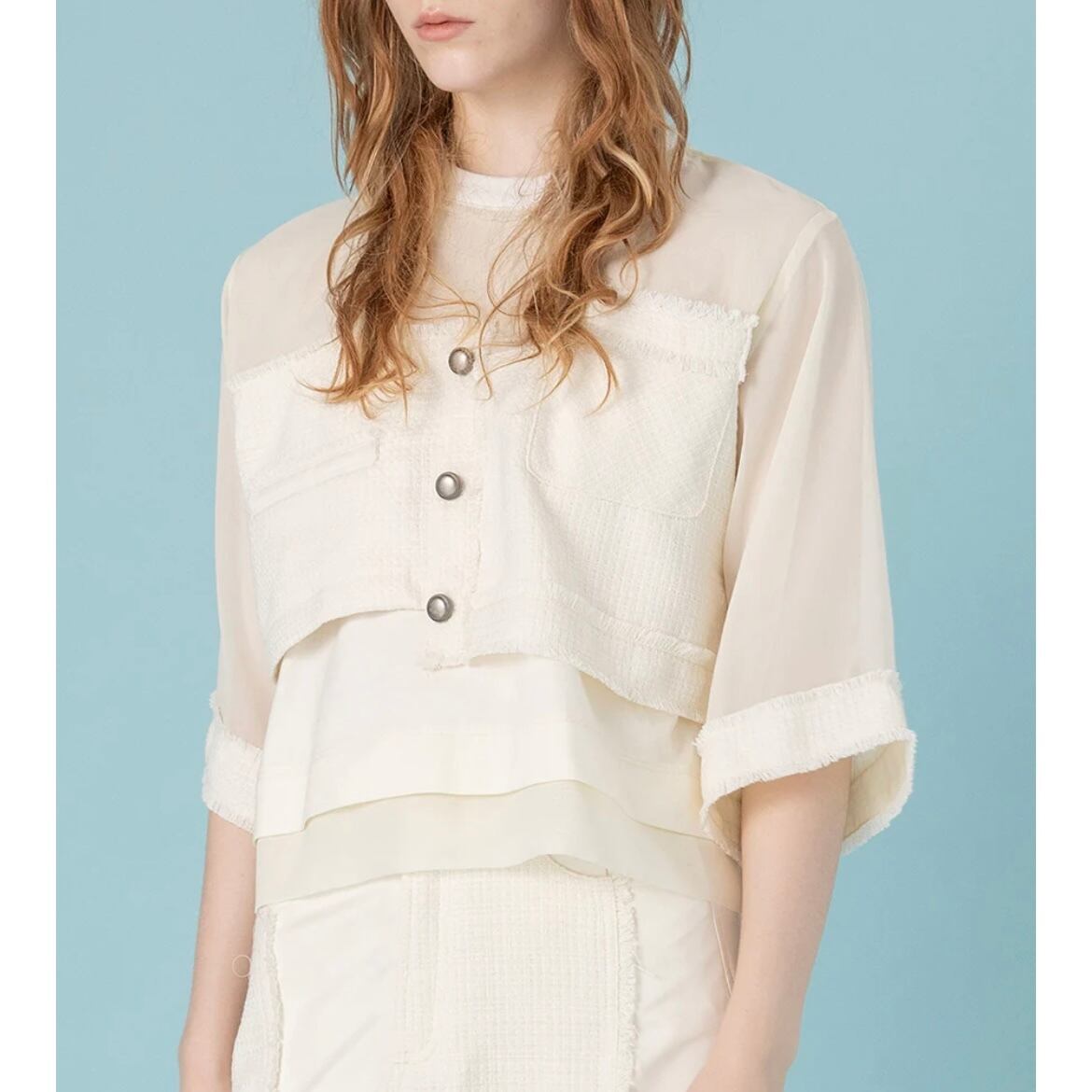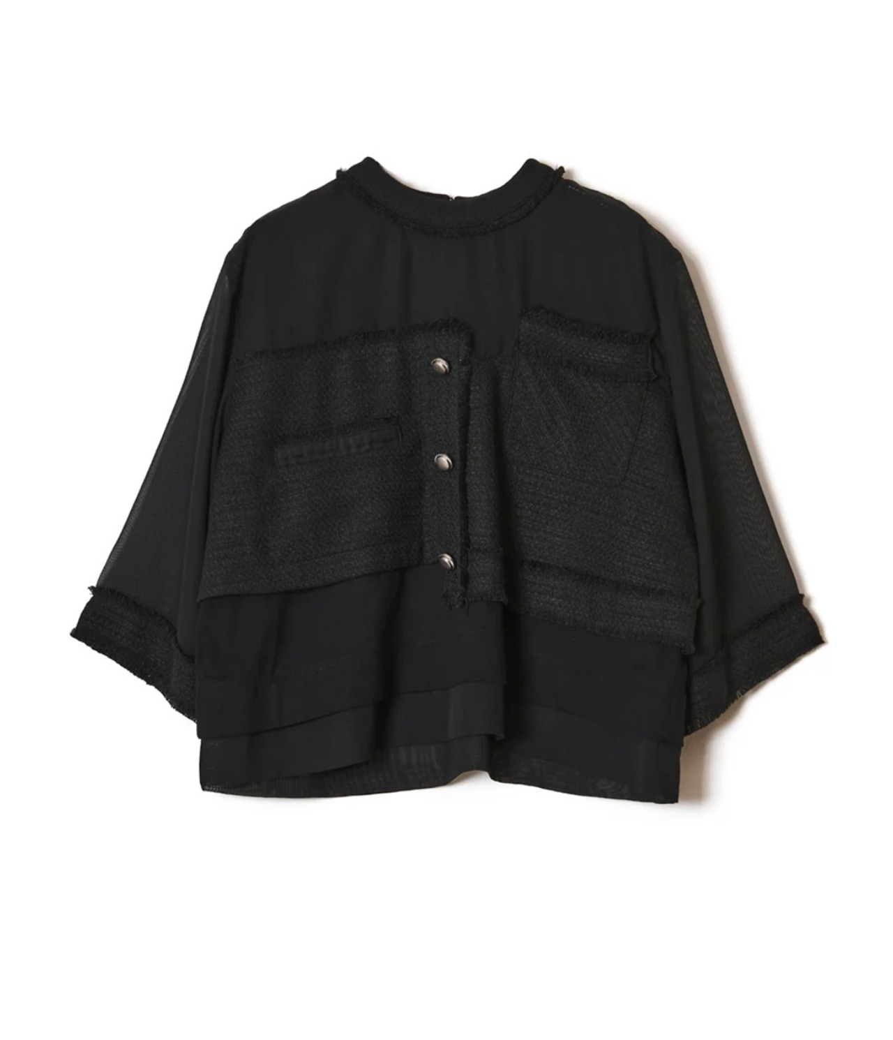 ツイードとシフォンと天竺カットソーのコンビネーショントップス。サマーツイードのジャケットデザインを身頃に入れることで、華やかで品のあるトップスに仕上がりました。きれいめスタイリングにもぴったりなブラウスのようなアイテムですが、身頃はきれい見えする天竺カットソーなので着心地良くラフに着用いただけます。バストやアームホールもゆとりがあるので肌離れが良く、夏も快適に着用できます。身頃のツイードより上はシフォン生地を使用。シフォンを2枚重ねているので、微かなシアー感でインナーの透けが気にならないのも嬉しいポイント◎。袖はシフォン1枚で軽やかな印象に。袖口が広い7分丈でブラウスのような上品さを演出。ツイードのフリンジデザインや左右アシンメトリーのポケットなど細部までこだわった遊び心のある1枚。後ろ中心にファスナー開きあり