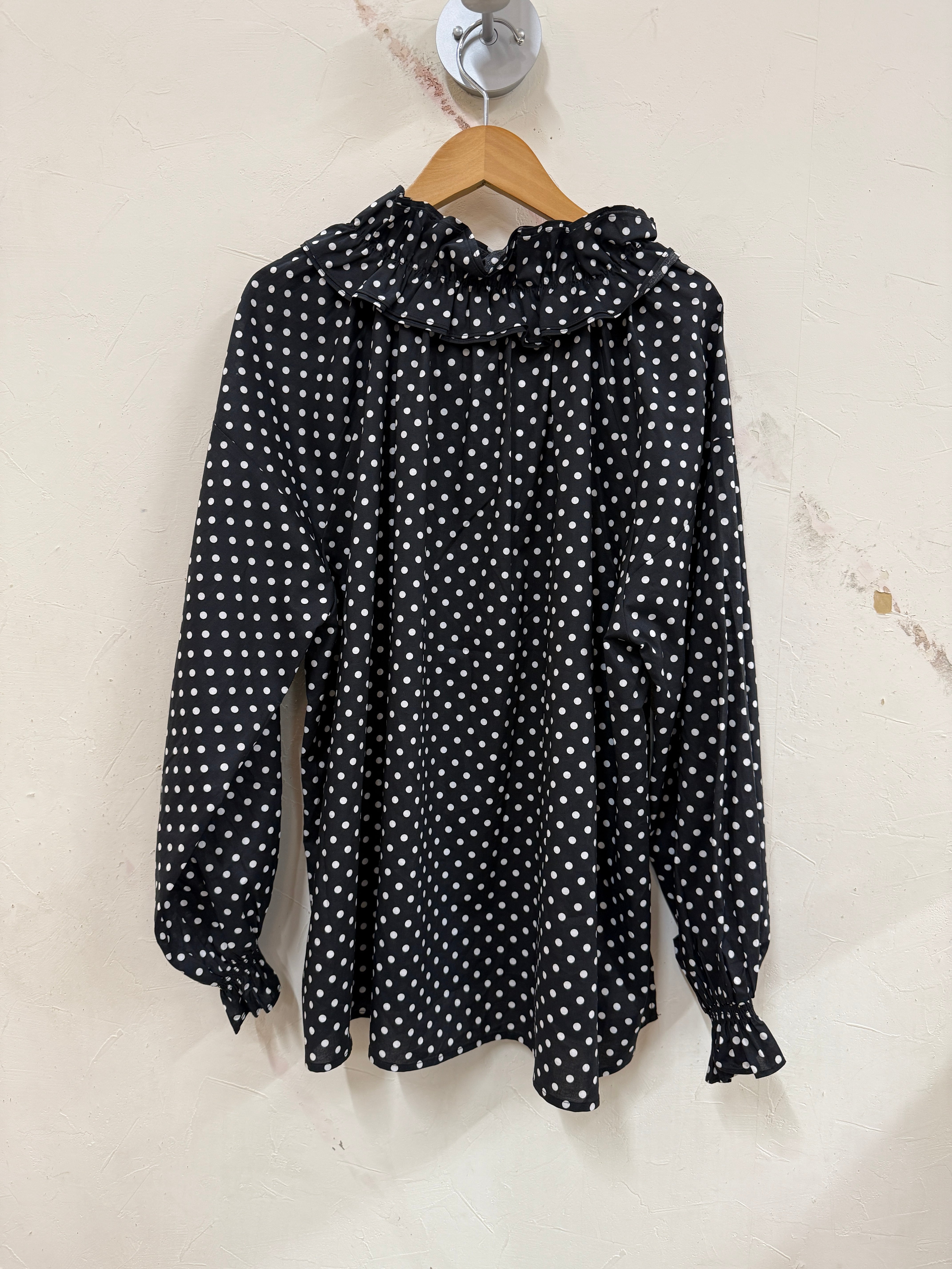 小さなドット柄が特徴的で、襟元と袖の部分にフリルがついているので、シンプルながらも可愛らしい印象を与えます。