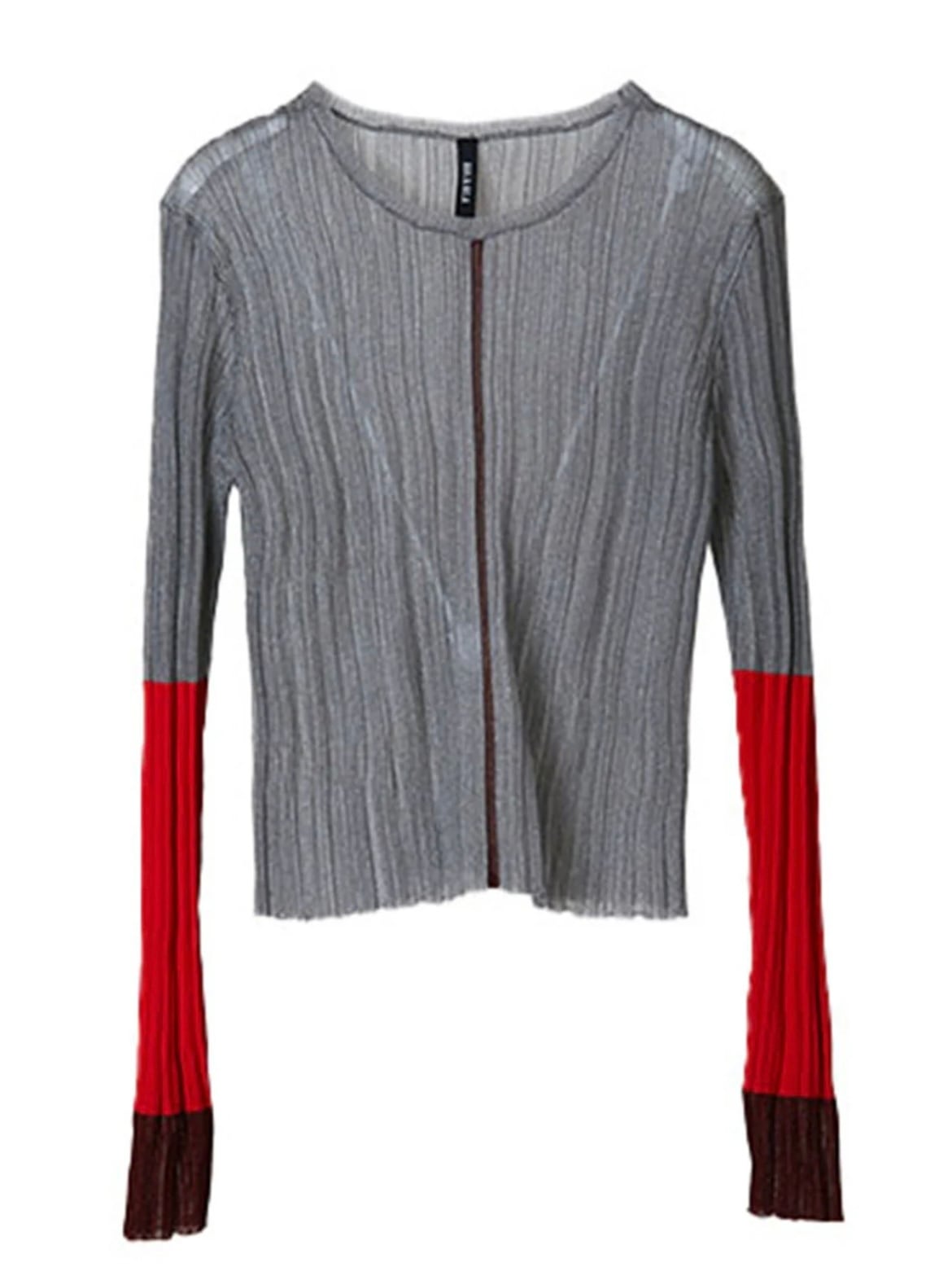 袖は透けない異素材糸で、大胆にカラーブロックにし、袖口にはラメ糸の配色を施しアクセントに。